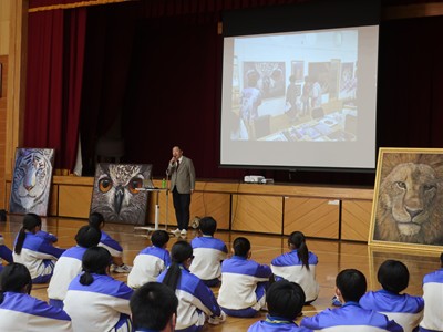 本日、本校の卒業生で画家の中村和美さんを講師にお招きして、講演会を行いました。実際に展覧会に出品した作品を披露していただきました。迫力ある作品に、生徒たちも圧倒されていました。