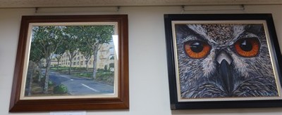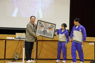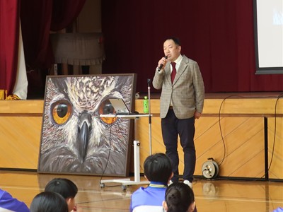 中村さんが描いたフクロウの絵画を、学校に寄贈していただきました。校長室前に、飾らせていただきました。来校された際に、是非ご覧下さい。